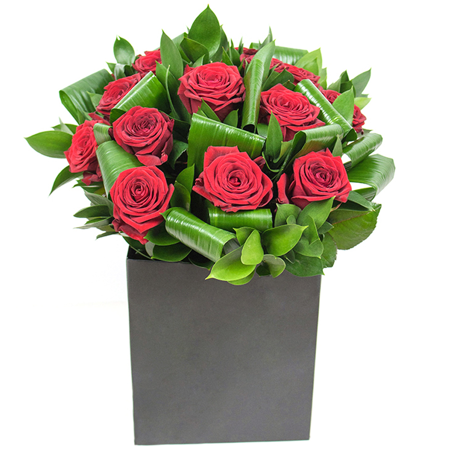 Elevate your space with our unique and stylish red roses bouquet. This stunning arrangement combines deep red roses with vibrant aspidistra leaves and graceful ruscus, creating a captivating display that exudes sophistication.